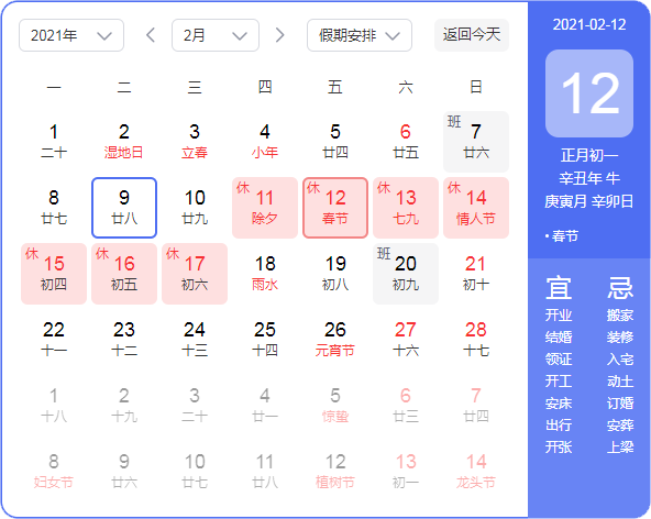 放假時(shí)間:2021年2月10日(周三)——2021年2月17日(周三),共八天。