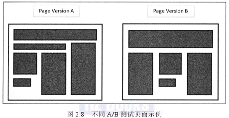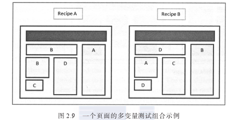 圖2.9展示了可以在網(wǎng)站設(shè)計(jì)多變量測(cè)試中同時(shí)測(cè)試的兩個(gè)頁(yè)面元素組合(每個(gè)模塊用不同的字母標(biāo)注).測(cè)試可以找出表現(xiàn)最佳的元素組合。