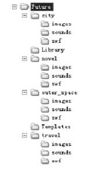 其中,Future為站點(diǎn)的根文件夾,在根文件夾下根據(jù)網(wǎng)站不同的主題可分為“未來都市”、未來旅游(travel))、未來太空(outerspace)、科幻小說(novel)等等欄目,每個(gè)欄目分別對(duì)應(yīng)不同的內(nèi)容。而每個(gè)主題所有文件均放在文件夾中,然后再進(jìn)一步地細(xì)分文件類型