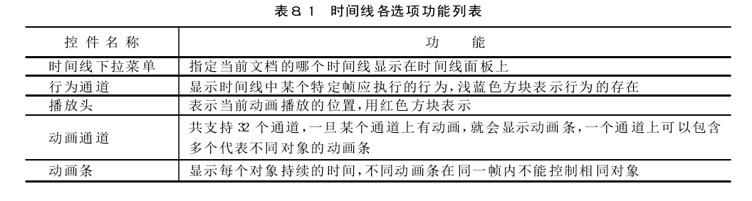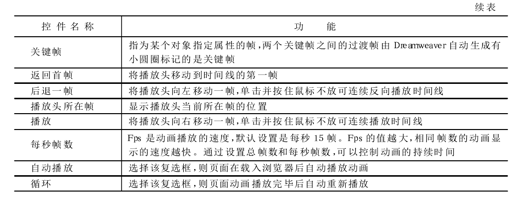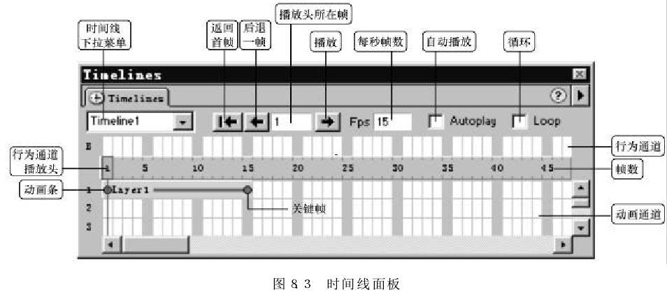 "Timeline(時(shí)間線)”面板描繪了層和圖像隨時(shí)間變化的屬性。在菜單欄中選擇“Window"→"Timelines"命令可打開(kāi)時(shí)間線面板。時(shí)間線面板所包含的控件如圖所示。
