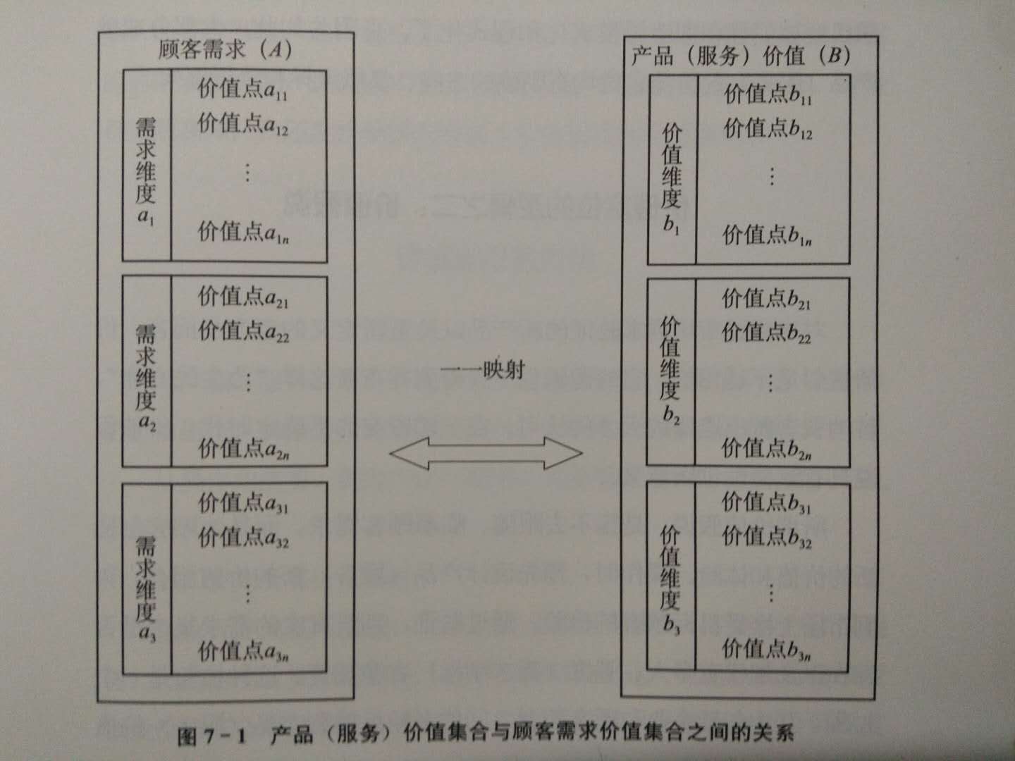 我們可以把顧客需求定義為A集合,產(chǎn)品(服務(wù))所提供的價(jià)值定義為B集合,A集合和B集合中有多個(gè)元素--價(jià)值點(diǎn)。B集合中的每個(gè)價(jià)值點(diǎn)都是對(duì)A集合中每個(gè)價(jià)值點(diǎn)的體認(rèn)、理解、臨摹和追隨,顧客需求的價(jià)值點(diǎn)是產(chǎn)品(服務(wù))價(jià)值點(diǎn)的原象價(jià)值定位基礎(chǔ)和依據(jù)),顯然,兩個(gè)集合之間存在一一映射的關(guān)系(見圖7-1)。